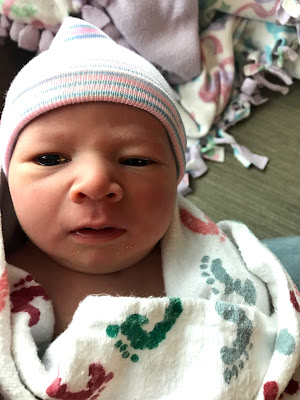 Luke said it only took 23 minutes of pushing. I felt him slip out of me and Luke laid him on my tummy. That's when I found out it was a boy. He was purple and grunting and definitely concerning me. I kept asking if that was normal and this nurse said yes. I didn't feel like it was. A neonatal nurse took him from me to the warmer to check on his breathing. He finally did a good scream and his color started to turn a healthy pink. He was still doing that grunting noise though so the director of the NICU came in to check on him. I wanted so badly for him to be back in my arms so we could do skin to skin and try nursing. I didn't want a repeat of how it went with Charlotte. They finally gave him back to me and then he peed and pooped all over me. The nurse never put a diaper on him so that's 3/3 of my babies that have marked their territory on me as soon as they were born!